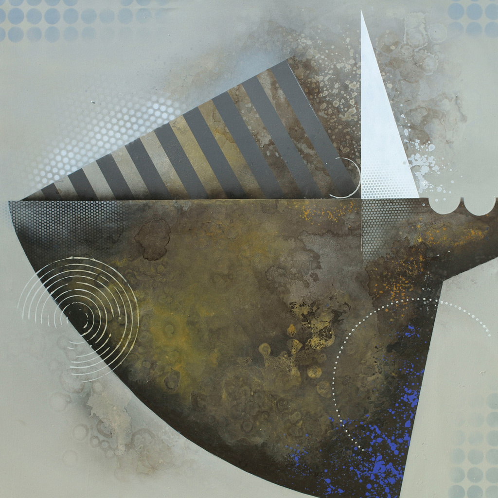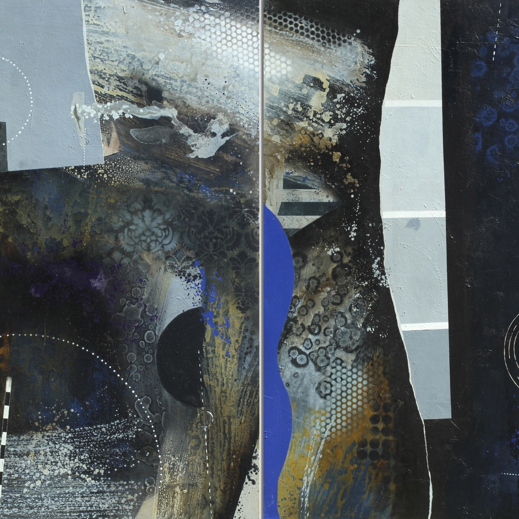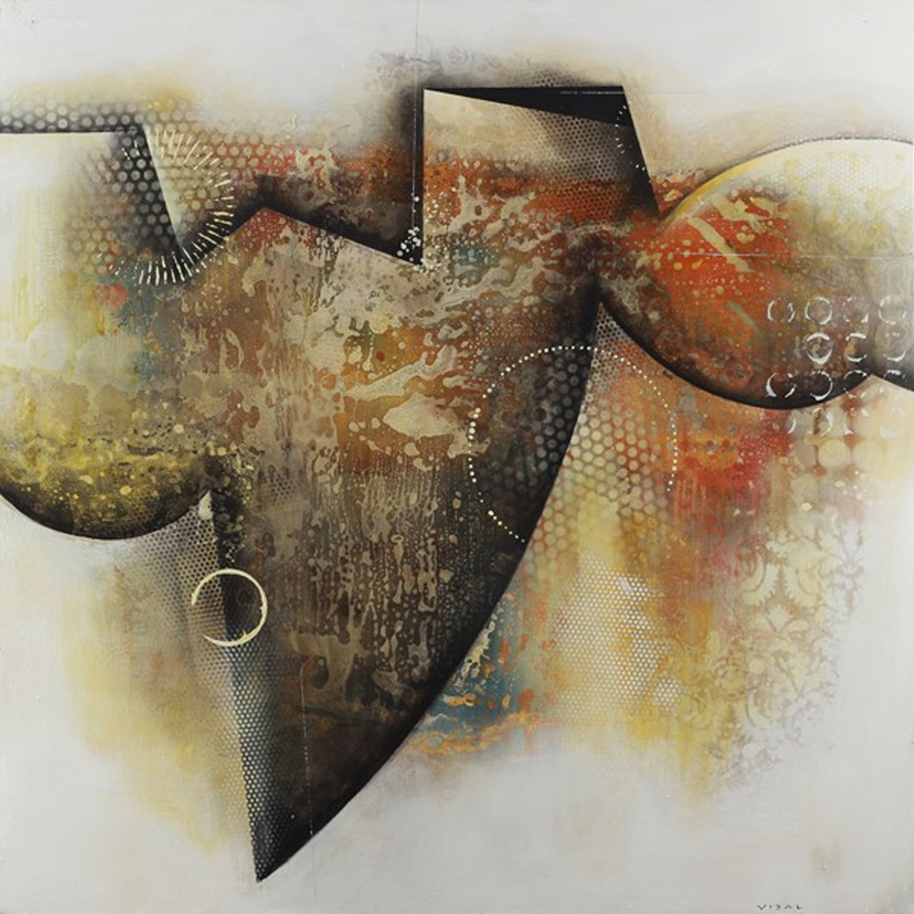 Asi, mi lenguaje pictórico, abstracto, va construyendo,entre superficies planas articuladas con superposiciones, recursos gráficos, matices cromáticos y texturas, los medios plásticos con los que voy construyendo mi discurso conceptual: las culturas milenarias de Oriente, El lenguaje de las matematicas, los viajes en el tiempo.